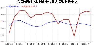制造業(yè)PMI除3月份短暫回升以外,持續(xù)小幅回落,顯示出經(jīng)濟(jì)增速逐漸趨緩。 5月份從11個(gè)分項(xiàng)指數(shù)均有不同程度回落,其中,新訂單指數(shù)、積壓訂單指數(shù)、購進(jìn)價(jià)格指數(shù)、原材料庫存指數(shù)回落較明顯,回落幅度超過1個(gè)百分點(diǎn),尤其以購進(jìn)價(jià)格指數(shù)回落幅度為最大,達(dá)到5.9個(gè)百分點(diǎn) 。