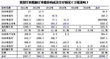 手持訂單中,低價(jià)船(危機(jī)爆發(fā)后承接訂單)所占比例接近60%,2012年交付訂單中低價(jià)船訂單所占比例預(yù)計(jì)將達(dá)66%,而2013年這一比例接近90%。