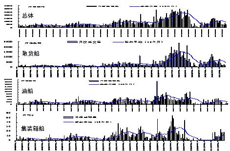 2) 導(dǎo)致市場波動(dòng)大:船舶運(yùn)力增減與海運(yùn)量升降不同步(滯后2年左右),從而,使航運(yùn)市場上供求不平衡加劇。(同樣船廠建設(shè)周期長,產(chǎn)能變化不能與需求匹配)。