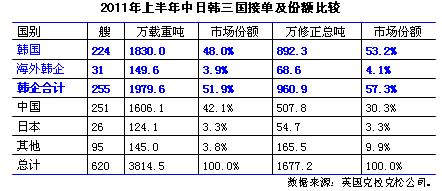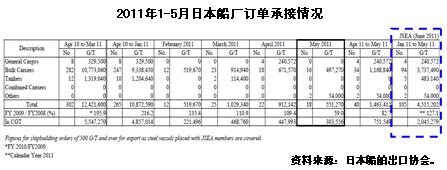根據(jù)日本造船協(xié)會(huì)統(tǒng)計(jì),2011年1-5月日本造船業(yè)承接出口船訂單105艘、205萬修正總噸(較克拉克松公司統(tǒng)計(jì)高出150萬修正總噸);