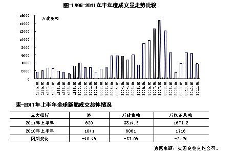 第二,2011年新船成交量將再度大幅回落。按1-6月成交態(tài)勢測算,今年全年成交量大致在8000萬載重噸左右,較上一年下滑幅度極有可能超過40%。
