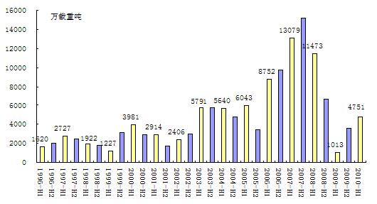 上半年新船成交量超預(yù)期。據(jù)英國克拉克松公司統(tǒng)計,2010年上半年全球累計成交新船624艘、4751萬載重噸,同比上升369%,其中,第二季度新船成交量明顯放大,月均成交量達(dá)1102萬載重噸,是第一季度平均單月成交量(482萬載重噸)的2.3倍,甚至超過2003-2006年興旺前期月均成交量水平。