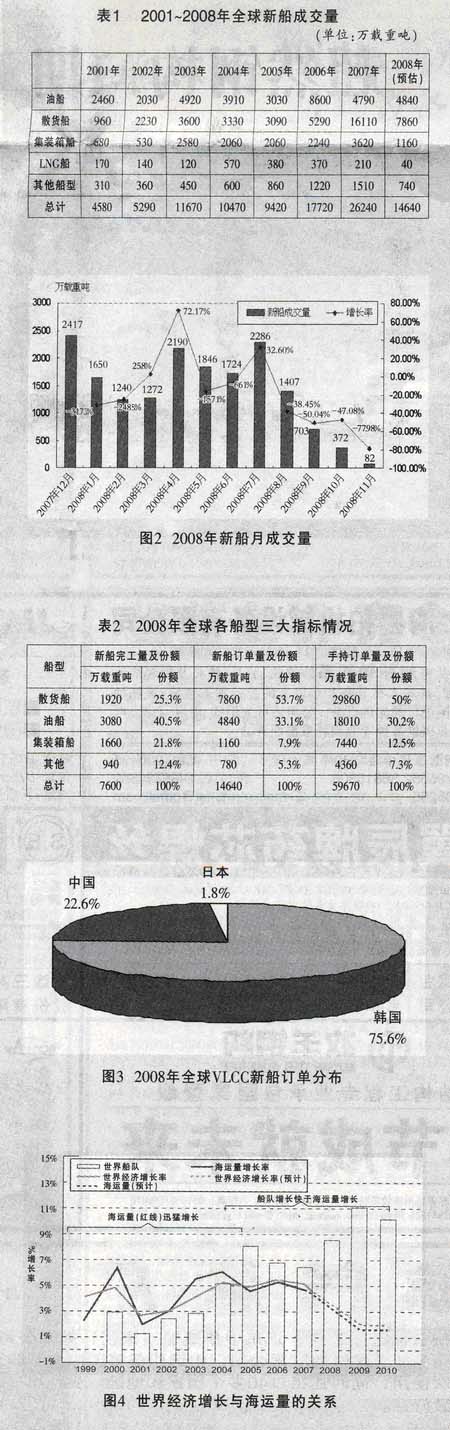 由于2009年全球宏觀經(jīng)濟(jì)衰退,考慮到目前11億噸船隊(duì)運(yùn)力和近6億噸手持訂單的壓力、船舶融資趨緊以及各項(xiàng)新規(guī)則的效用已經(jīng)釋放等諸多不利因素的影響,預(yù)計(jì)2009年船舶市場(chǎng)整體陷入低迷狀態(tài),調(diào)整將因全球經(jīng)濟(jì)的狀況而持續(xù)2~4年時(shí)間。