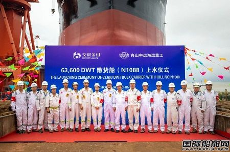 9月22日10點38分,舟山中遠海運重工為交銀金融租賃股份有限公司建造的63600噸系列散貨船第三艘船(N1088)在公司2號船臺順利上水。