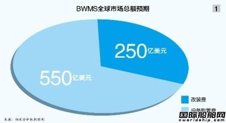 相關(guān)分析機(jī)構(gòu)做出預(yù)測(cè)稱(chēng),《壓載水公約》生效后將給BWMS制造商帶來(lái)近800億美元的市場(chǎng)總量,對(duì)于BWMS這種船配市場(chǎng)的輕量級(jí)產(chǎn)品來(lái)說(shuō),這個(gè)數(shù)字是驚人的。另?yè)?jù)某投行交通事業(yè)部的進(jìn)一步分析,這塊800億美元的“大蛋糕”由占總比68.75%、總額達(dá)550億美元的設(shè)備購(gòu)置市場(chǎng)和占總比31.25%、總額達(dá)250億美元的改裝市場(chǎng)構(gòu)成(見(jiàn)圖1)。
