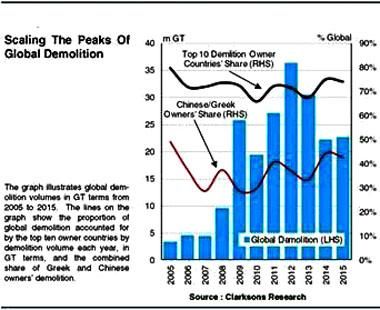 雖然拆船有所放緩,2014年和2015年的拆船總量約高于2005年至2013年年平均1810萬GT的25%。受中國出口至印度廉價(jià)鋼坯的影響,廢鋼價(jià)格走低,自2015年來,降幅已達(dá)40%。