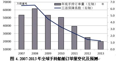 2013年度手持訂單量預(yù)測。按照上述預(yù)測,根據(jù)大致測算公司“期末手持訂單量=期初手持訂單量-期間造船完工量+期間新船訂單量-期間訂單撤銷量”,預(yù)計2012年底全球手持船舶訂單量降至2.5億載重噸,2013年可能進一步跌破2億載重噸。全球造船業(yè)工活保障系數(shù)由2007年6.6年將跌至2012年底1.6年,2013年進一步下滑至1.25年(以1.6億載重噸有效產(chǎn)能測算),預(yù)計2013年全球?qū)⒂懈嗟拇瑥S面臨無船開工的局面。